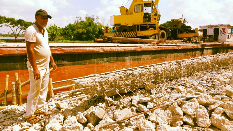 সরেজমিনে ব্রিজ এলকায় গিয়ে দেখা যায় ব্রিজের পাইল গাড়ার কাজ চলছে। ৬৪ টি পাইলের ৬০ টি পাইল স্থাপন করা হয়েছে। তবে প্রত্যেকটি পাইলের অর্ধেক পাইল মাটির নিচে ঢুকানোর পর বাকি অর্ধেক পাইল কেটে রড বের করছে ঠিকাদারের লোকজন। পাইলের রড কাটার জন্য ৩ জন শ্রমিক কাজ করছেন। আনোয়ার সরদার নামের এক শ্রমিক বলেন, তিনি খুলনা থেকে এসেছেন। তার সাথে আরো দুজন রয়েছেন। তাদের কাজ মাটির উপরের থাকা পাইলের অশেংর রড় বের করে আলাদা করা।