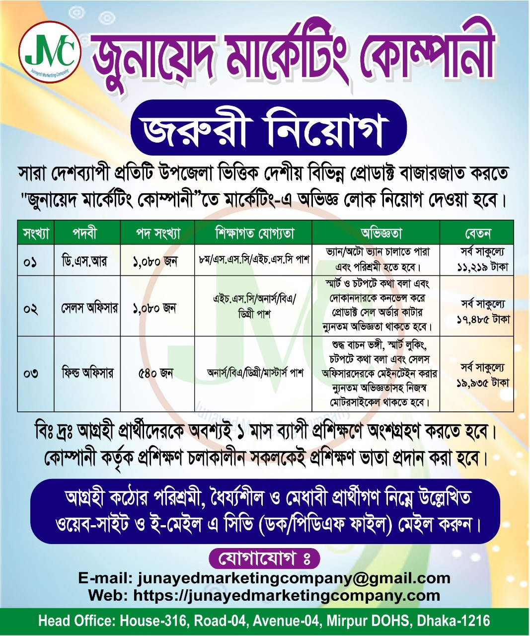 জুনায়েদ মার্কেটিং কম্পানীতে নিয়োগ বিজ্ঞপ্তি